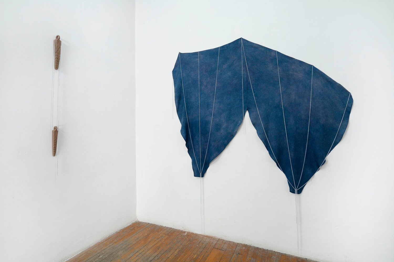 En otra exploración de índigo sobre tela, Lóbulos (2024), la artista tiende múltiples piezas de seda con diferentes intensidades de tinte índigo que toman su forma a partir de los pétalos o cortes de diagramas desplegados de la tierra. En el lexicón de la artista, las formas estiradas en Lóbulos se transforman en lenguas al tiempo que evocan antiguas formas terrestres como las estalactitas. Esta instalación dialoga con la obra literaria de Gloria Anzaldúa, quien en su libro Borderlands escribió: “Tendré mi lengua de serpiente, mi voz de mujer, mi voz sexual, mi voz de poeta. Superaré la tradición del silencio.” (Anzaldua, 59) La variedad de matices de índigo que nos ofrece la artista, señalan los vastos linajes culturales, políticos y espirituales del pigmento.