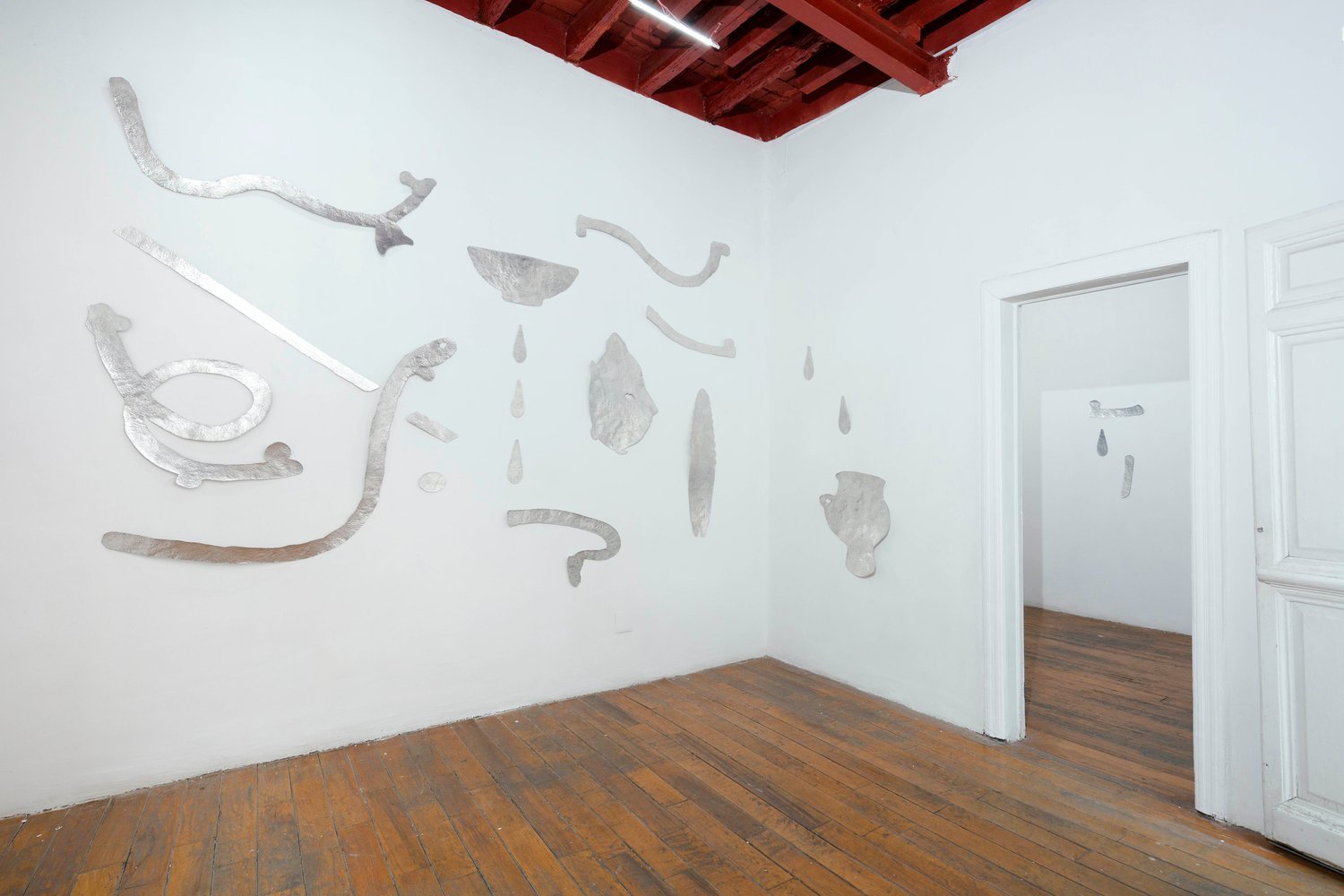 Salón Silicón presents the first solo exhibition in Mexico City by Brooklyn-based artist Alva Mooses. Medida del Mar features the artist’s recent works, which have developed in material, conceptual, and affective ways. The exhibition includes aluminum cutouts, textiles, prints, ceramics, and a sound installation resulting from investigations developed over several years. Mooses’ imagery originates from a terrestrial globe model cast in clay in which the arc, base, and knobs traversing the axis are reconfigured. Through broken structures, Mooses generates a series of symbols that, although asemic, highlight the possibility of new constructions, languages, and ways of measuring the world. The artist explores wringing, draining, and spinning––rethinking world-measuring devices while tracing formal and affective threads between body and earth.