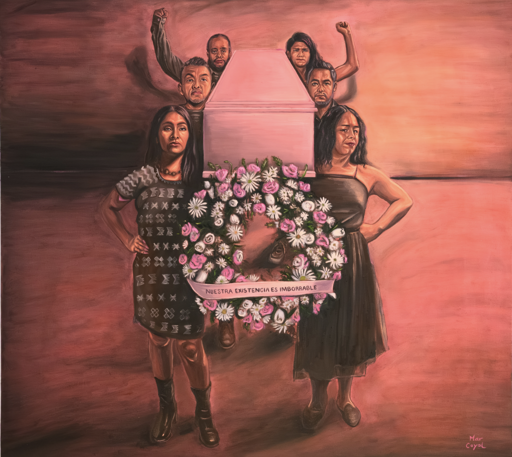 Alzando un ataúd y un arreglo floral con la leyenda “nuestra existencia es imborrable”, sus personajes diversxs avanzan implacablemente para confrontar al espectador ante la compleja red de exclusión y agresiones que atraviesa y acaba con sus vidas, producto del cruce sistémico de racismo, sexismo, clasismo, transfobia y homofobia. Una situación por la que milenariamente trabajamos y enarbolamos cantos, para transformar así nuestro presente.