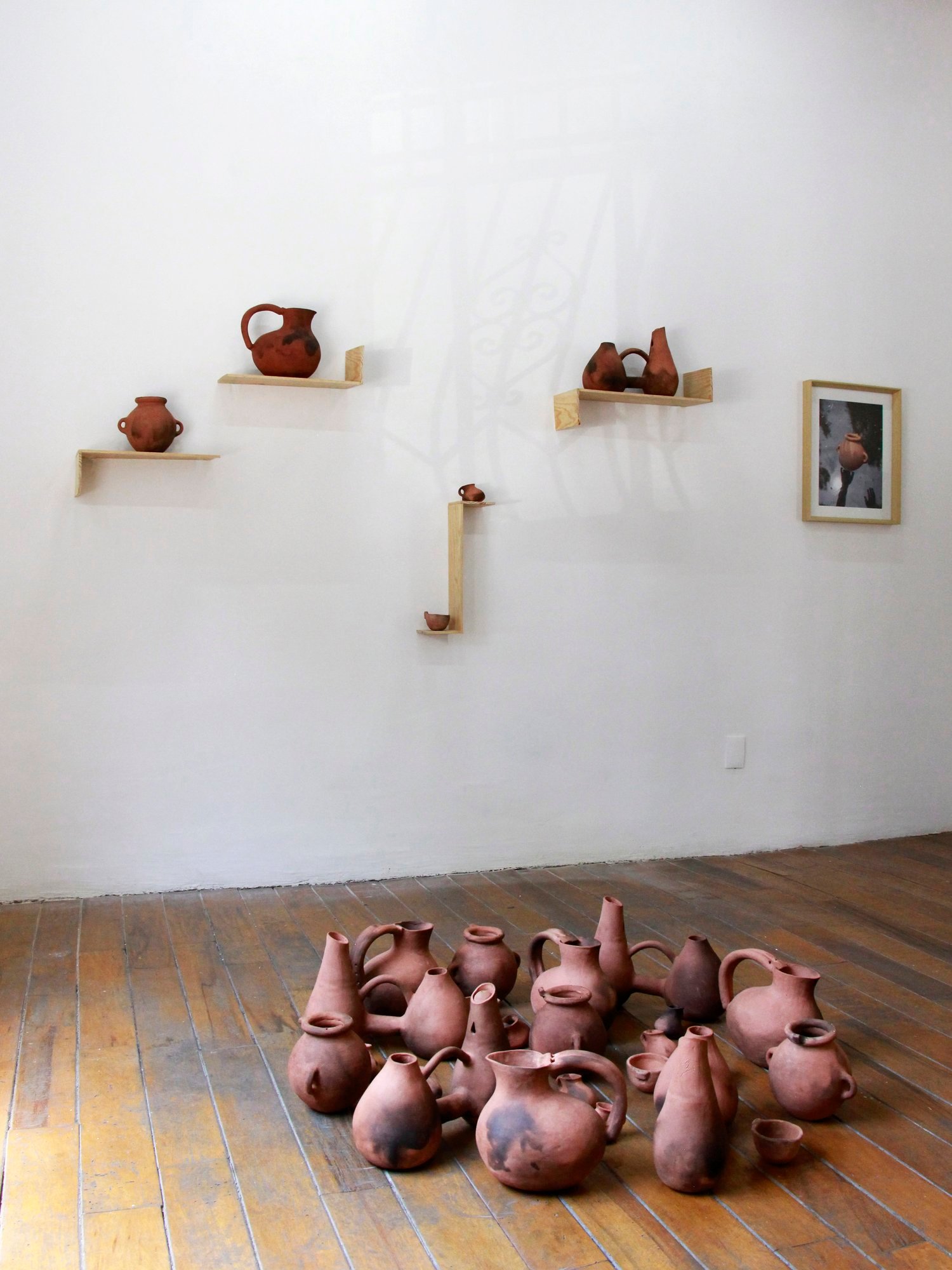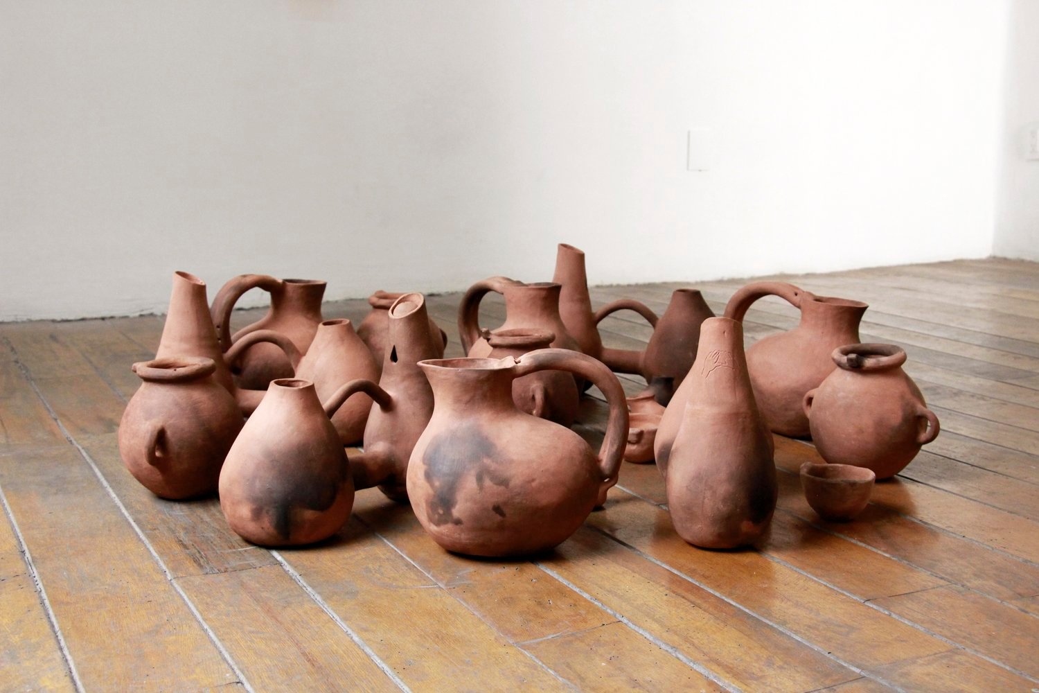 Bea Millón me cuenta que, tras un periodo de trabajo e investigación en sitios afectados por extractivismo minero -un tiempo acompañado de duelos-, anidó en ella el deseo de recorrer los ríos y acuíferos amenazados de la Ciudad de México, ciudad que ha elegido como lugar de vida. Sus cántaros materializan un momento de respiro, de refugio, de conectividad y de vinculación con lo pequeño. Dan cuenta también de un proceso de (auto)sanación tras las múltiples crisis intensificadas por la pandemia del Covid19. De un tiempo para acá, el colapso social y ecológico se acelera y expande su alcance horizontalmente. El sistema se desploma -cayendo también sobre nuestros cuerpos-, en un berrinche demencial que intenta reafirmar sus viejas estructuras heteropatriarcales, capitalistas, coloniales, autoritarias, extractivistas y militaristas. Este momento peligroso nos ha volcado la mirada hacia la importancia de nuestros vínculos con otros humanos y otros/más-que-humanos, la urgencia de propagar economías pequeñas, la centralidad del trabajo reproductivo, la necesidad de nutrir formas de autonomía y soberanía alimentaria, y nuestra interdependencia con la tierra y con el agua.