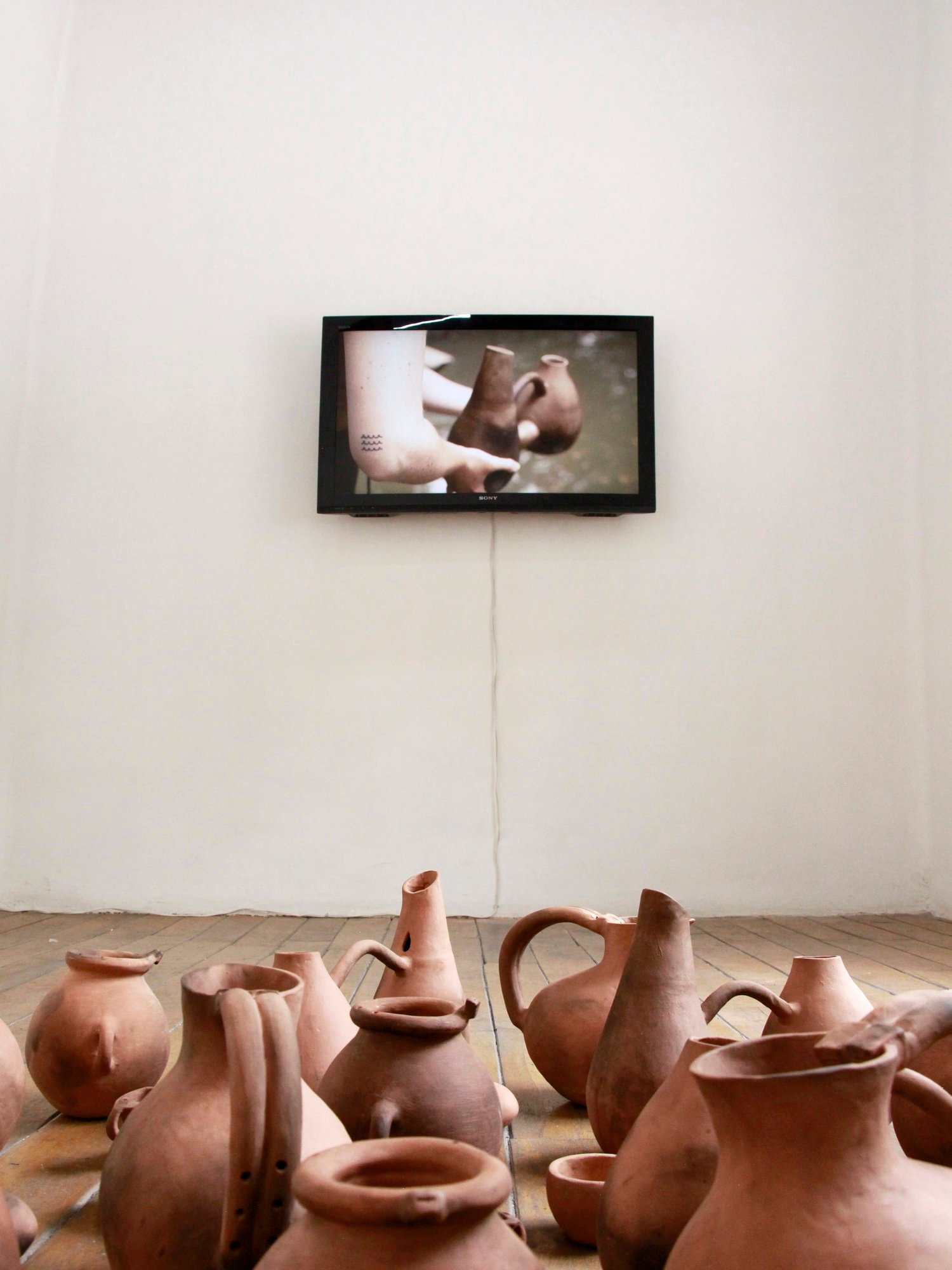Bea’s clay jars/tits/bellies sing when the wind blows through them and when water moves within them. By making the jars resonate, Bea pursues voices and cries that have long traveled her body. The kneading of earth and water, the burning, the air, and the water that flow through the hollow surfaces respond to precolonial technologies developed extensively by Mesoamerican and Andean societies to create sound frequencies. These frequencies induce states of animated stillness, contemplation, and the manifestation of other states of consciousness, and a way of inhabiting time in a non-linear man- ner, where past, present, and future overlap.