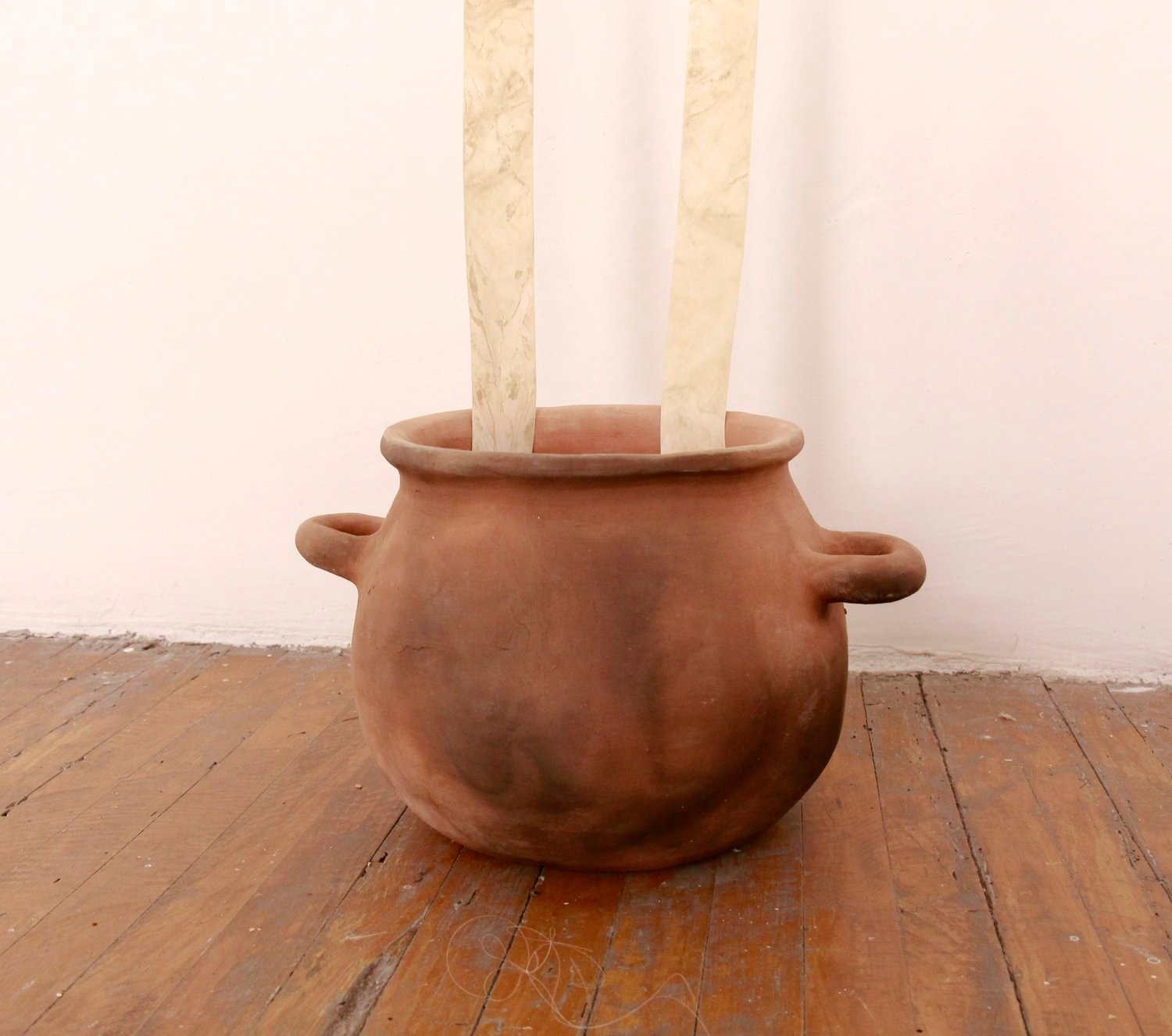 Los cántaros de Bea resuenan con ese tiempo pasado/futuro de las estéticas colectivas de la tierra, que todavía no está del todo aquí. Bea hace un pausa y se pregunta por la relación de estos procesos con su blanquitud, su migración con pasaporte europeo, por el posicionamiento que ocupa dentro de los ordenamientos simbólicos y materiales determinados por la colonialidad. Estamos inevitablemente determinades por ellos, y a pesar de ello, existe la posibilidad de exceder y disentir de esas lógicas que nos predeterminan. Bea apuesta por ese lugar del “a pesar de”, del exceso, asumiendo con fluidez, vitalidad y erotismo la posibilidad del fracaso.