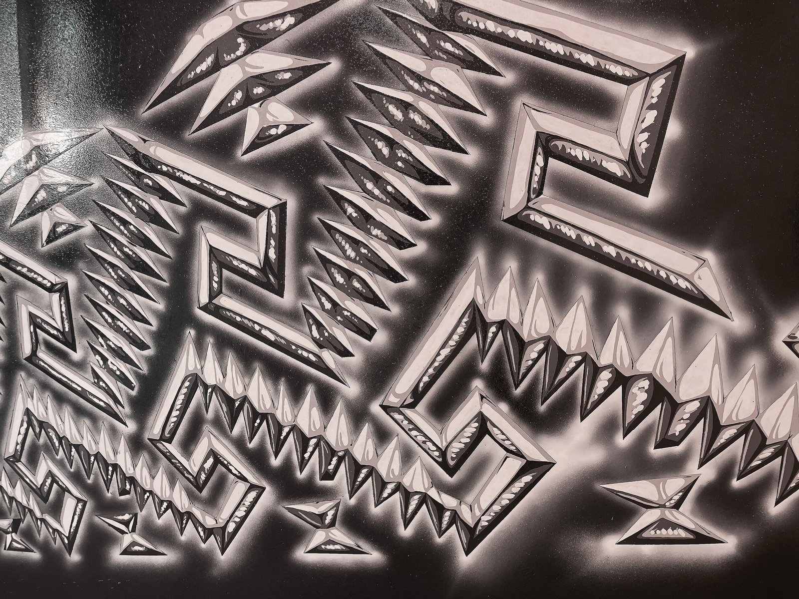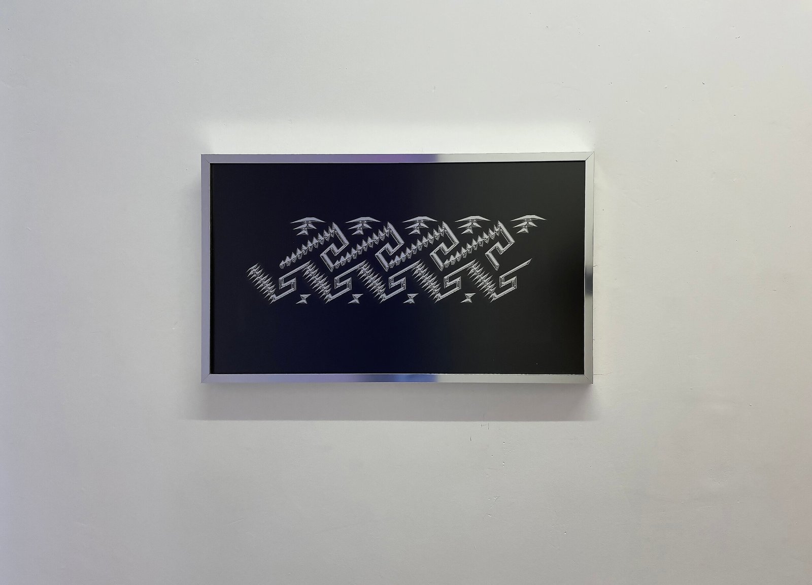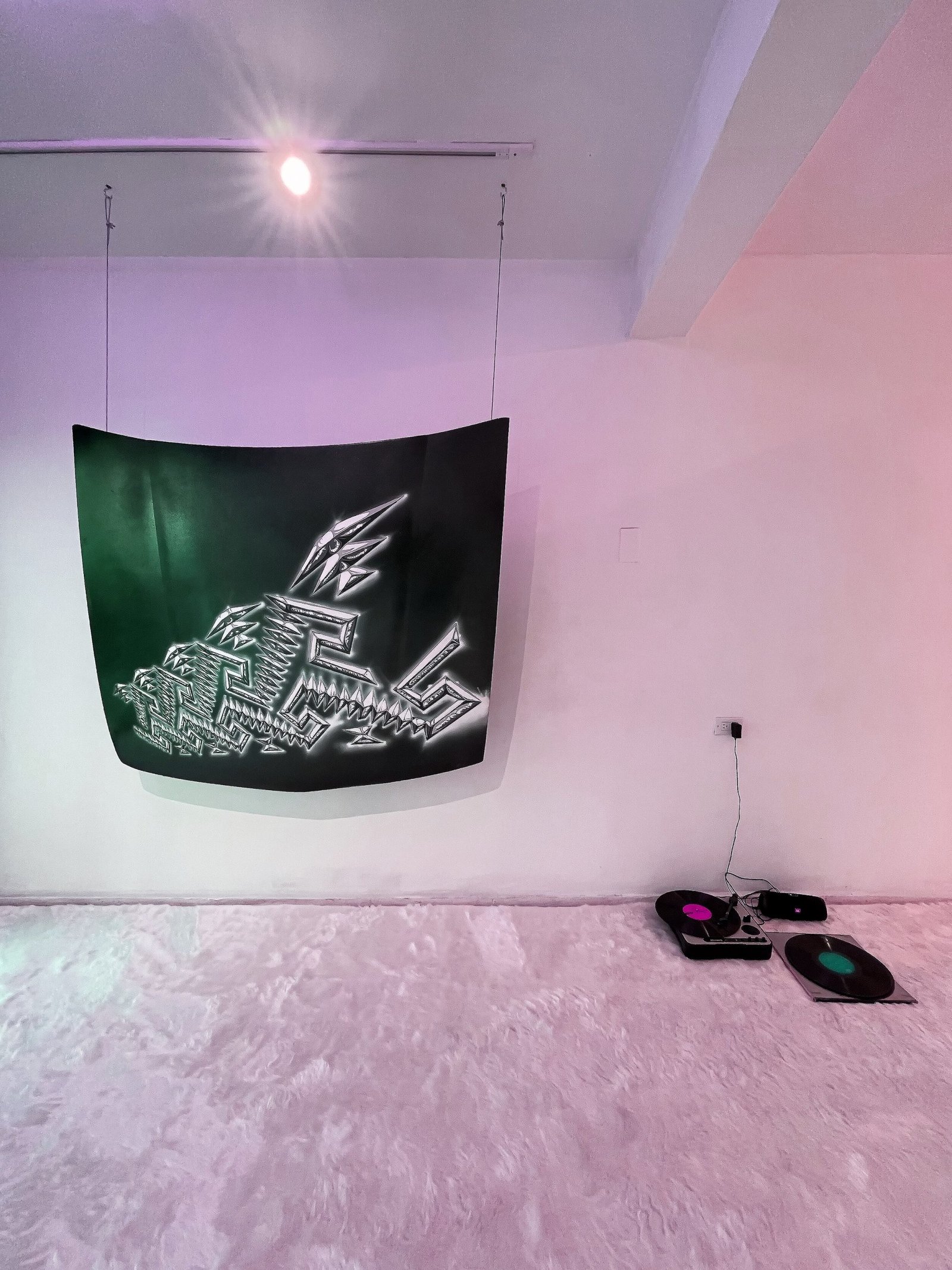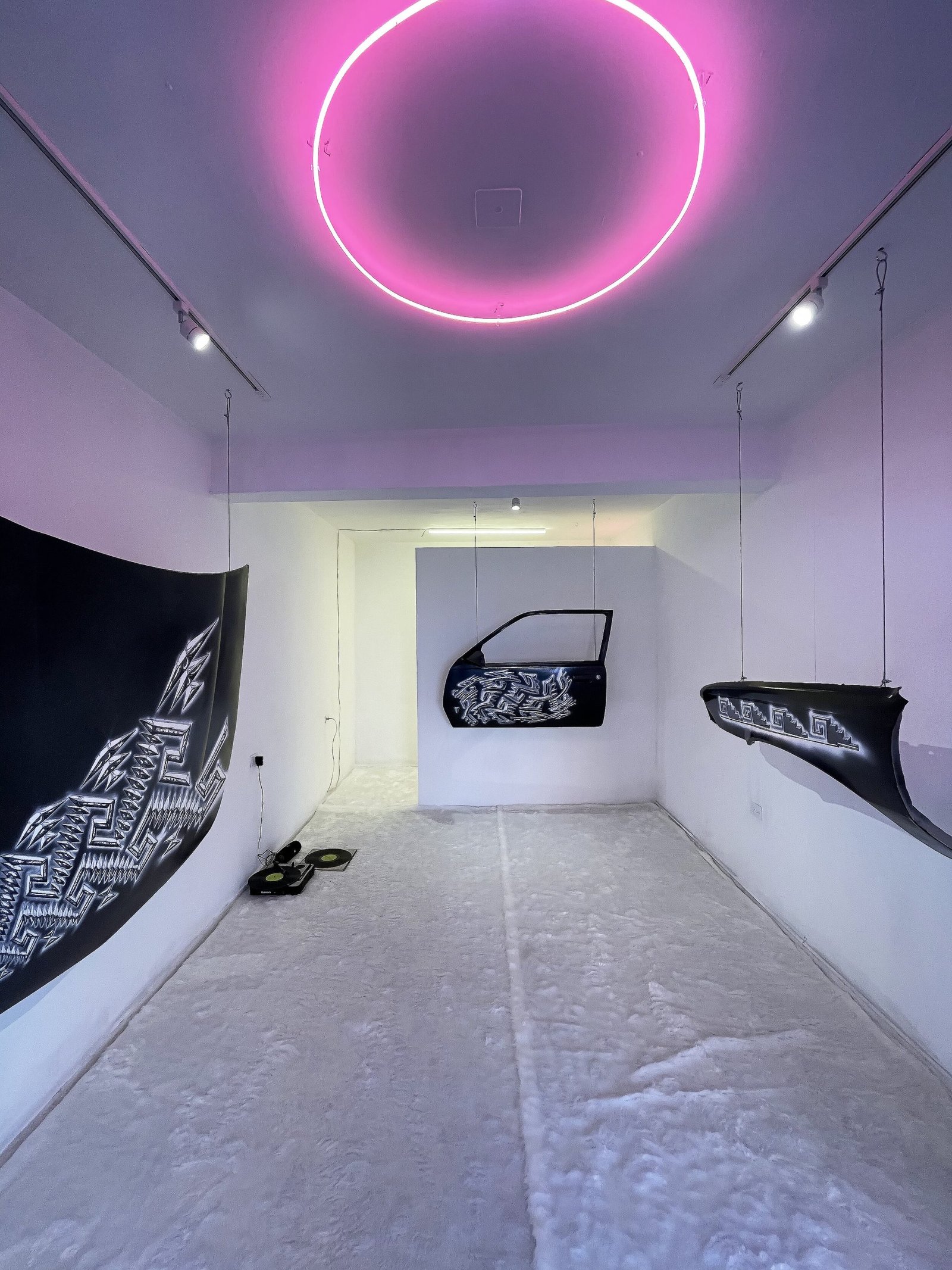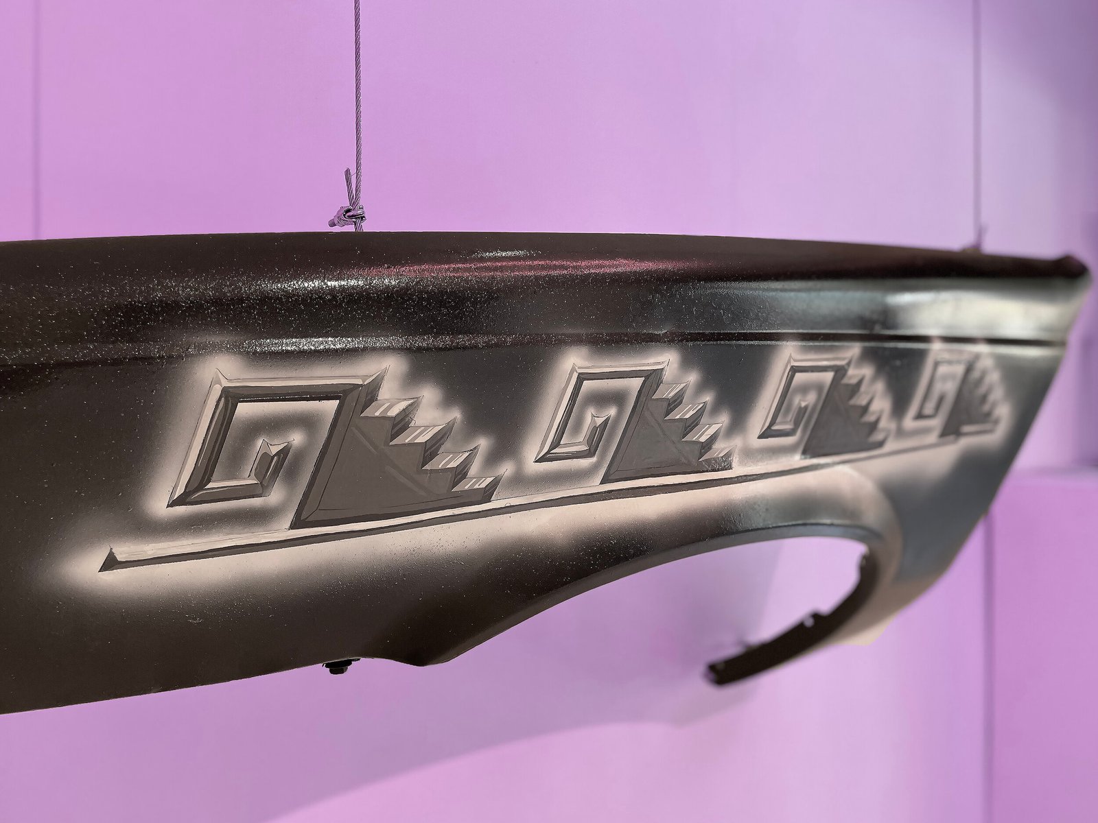 El fragmento, la materia y los signos redefinen las secciones de este artefacto mecánico. Así, Medina plantea una tensión entre el objeto original y su estatuto como superficie pictórica. El brillo multicolor de la capa de esmalte contrasta con el acabado mate y el molde de las grecas intervenidas. Dicha resolución invita a pensar en las suaves pero potentes melodías y ritmos híbridos de Ritchie Valens. La superposición de elementos concluye con un señalamiento al lenguaje, en donde el símbolo de la greca confirma una relación entre lo espiritual y lo material, siendo Mitla (junto sus decoraciones geométricas) conocida como “lugar de los muertos”, derivado del náhuatl, y como “lugar de descanso” en zapoteco (Lyobáa). Chicanoxtlán está lleno de estratos culturales y códigos redefinidos. Se trata de un ambiente visual, auditivo y sensitivo trans-histórico que conecta la antigua ciudad de Mitla con el rock chicano de los 50’, o vincula la Oaxaca de los 80’ con nuestro presente, a través de un recorrido en espiral que sigue el patrón de la greca y el mito del eterno retorno. ¿Qué traslado temporal acontece frente esta experiencia? ¿Qué deseos atraviesan a esta escenografía nostálgica? ¿Qué restos materiales e inmateriales reposan en este lugar?