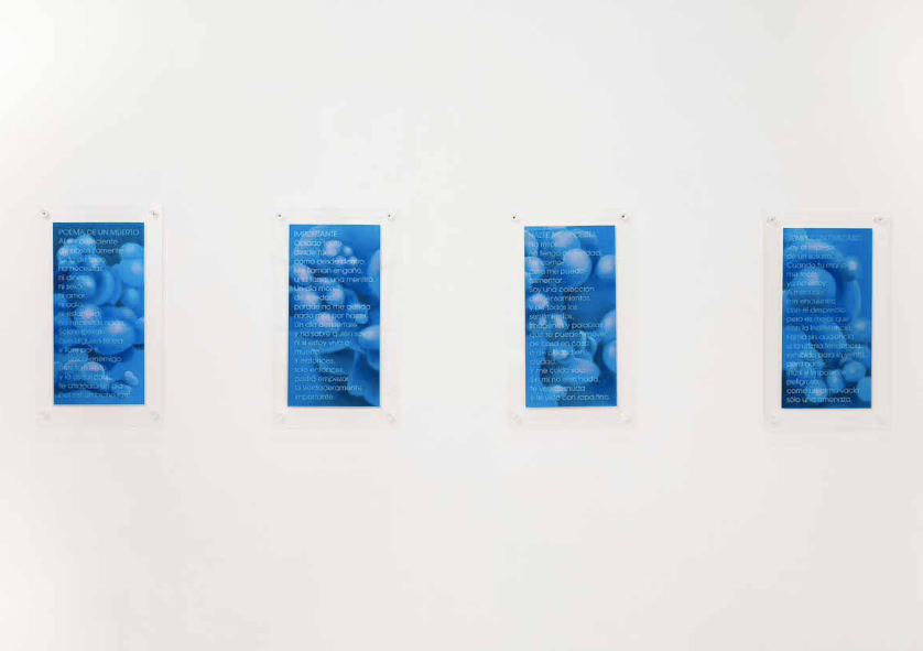 Ella me encarga generar textos e imágenes basados en sus indicaciones, casi como partituras fluxus, que luego edita meticulosamente y transforma en piezas analógicas inspiradas en estética digital. Observo su fascinación por la interacción entre texto e imagen, su deseo de explorar la compleja y eterna lucha entre la imagen y la idea. En ocasiones, el texto sirve para realzar la imagen, añadiendo profundidad y matices a su interpretación. En otros casos, bloquea o incluso contradice el mensaje deseado, lo que obliga al espectador a lidiar con sus propias nociones preconcebidas sobre el tema. Lo que logra es un delicado equilibrio entre armonía y discordia, claridad y ambigüedad.
