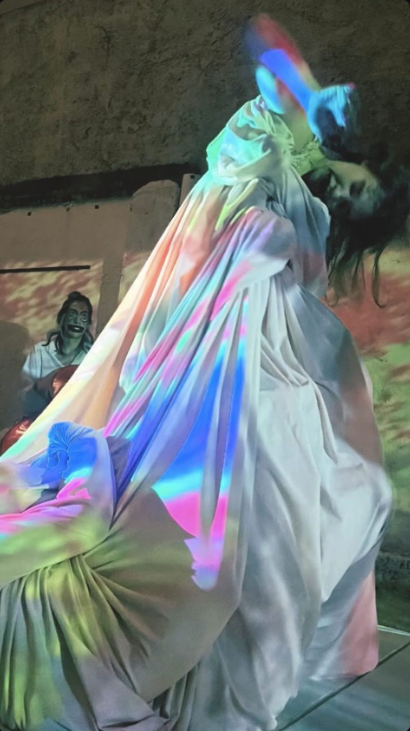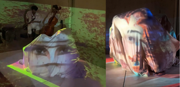 El segundo nivel fue el performance ECLOSIÓN, una coreografía a tres cuerpas dentro de una tela matriz de la que emerge Gurrumata, simbolizando su nacimiento a esta dimensión ficticia.