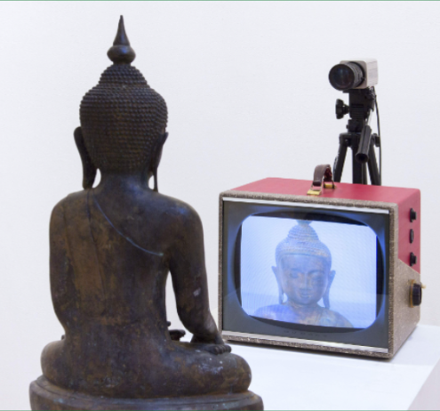 Finihario, el cuarto nivel, fue un performance de larga duración que desembocó en una fiesta de té entre amigas. Una de las inspiraciones para esta pieza fueron las esculturas de Buda mirándose a sí mismo eternamente en la televisión, de Nam June Paik.