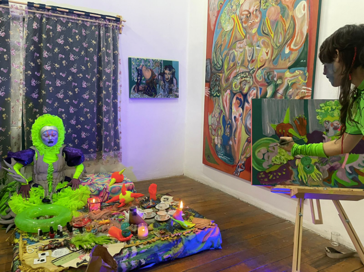 La expo fue el catalizador que permitió la expansión fuera de la pantalla hacia otros cuerpos y soportes dispuestos. Se necesitaba crear la nación digital-analógica en la que Gurru pueda existir acuerpada por otrxs, no sólo a través de la carne o el óleo, sino también en ejercicios y experimentos estéticos y performativos.