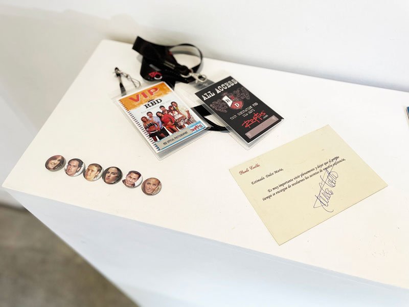 En esta muestra, las fotos son acompañadas por algunos objetos como: el celular rosa de Mía Colucci, las Barbies oficiales de la novela, los gafetes de los tours, las cartas de lxs fans (entre ellas la carta de Paulo Coelho a Dulce María), de igual manera podemos ver fotos sus colecciones de objetos de RBD. El objeto tangible para lxs fans se vuelve un fetiche importante de conservar, un objeto que adquiere un significado específico para cada unx, algo que nos recuerda al fetichismo del coleccionismo del arte contemporáneo.
