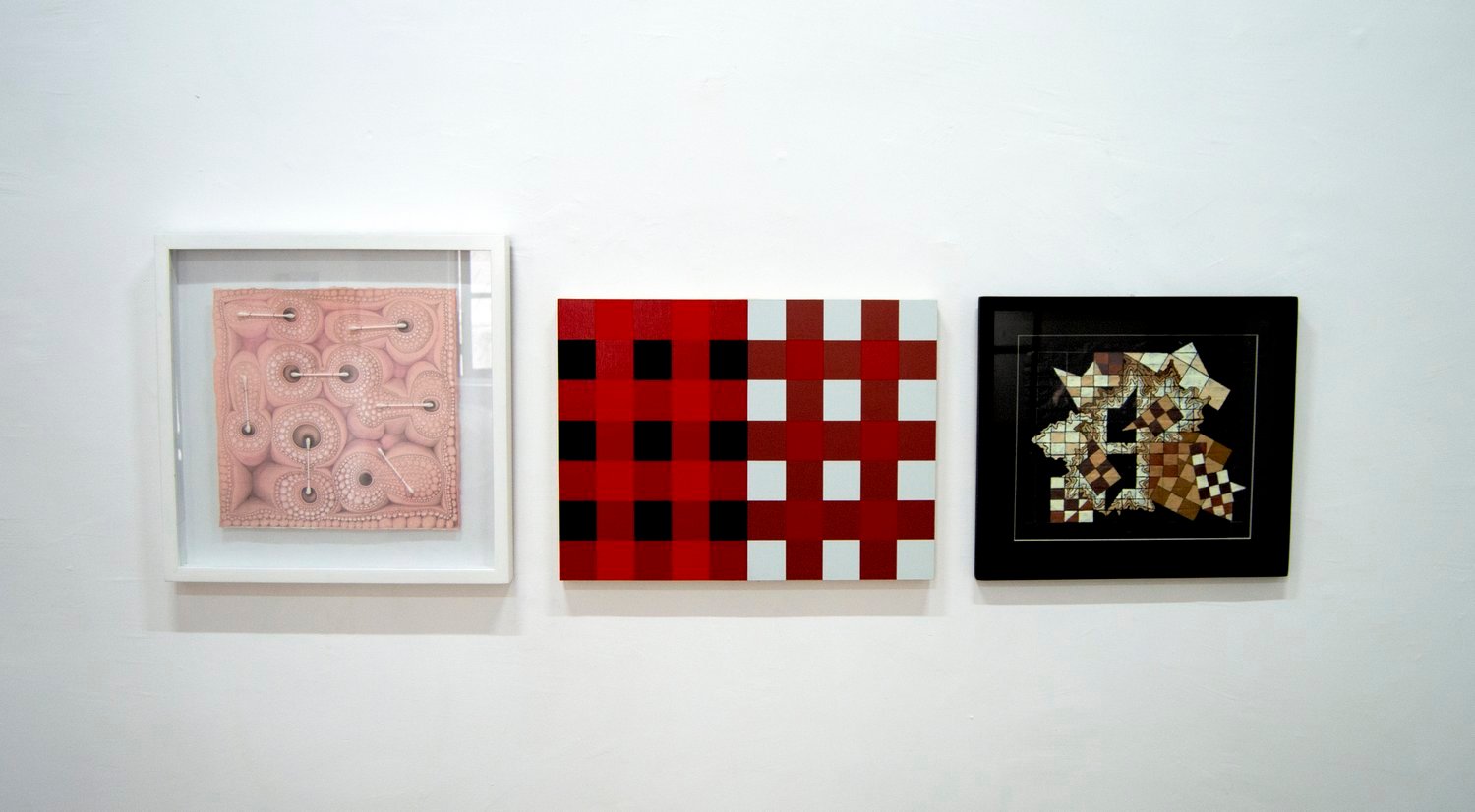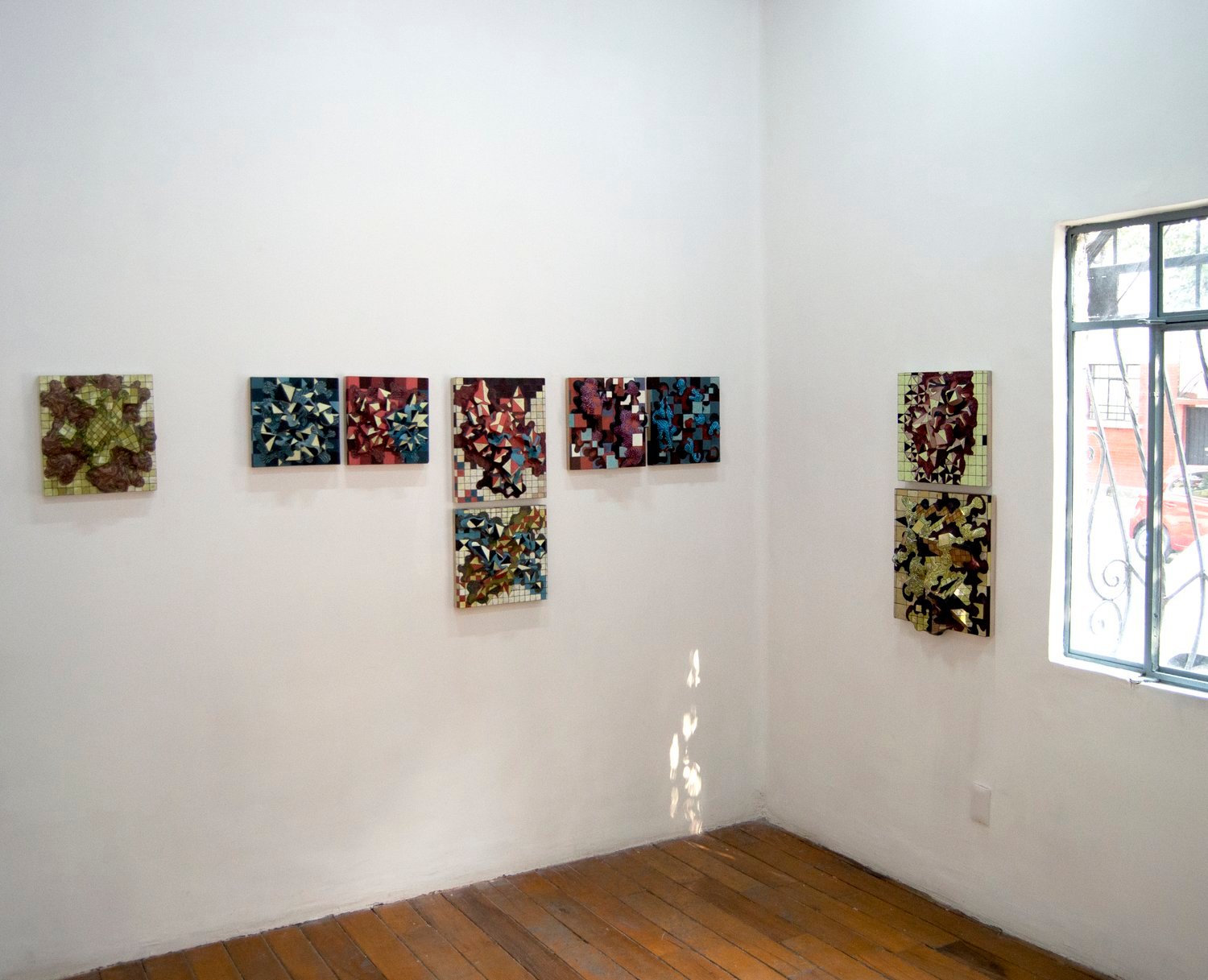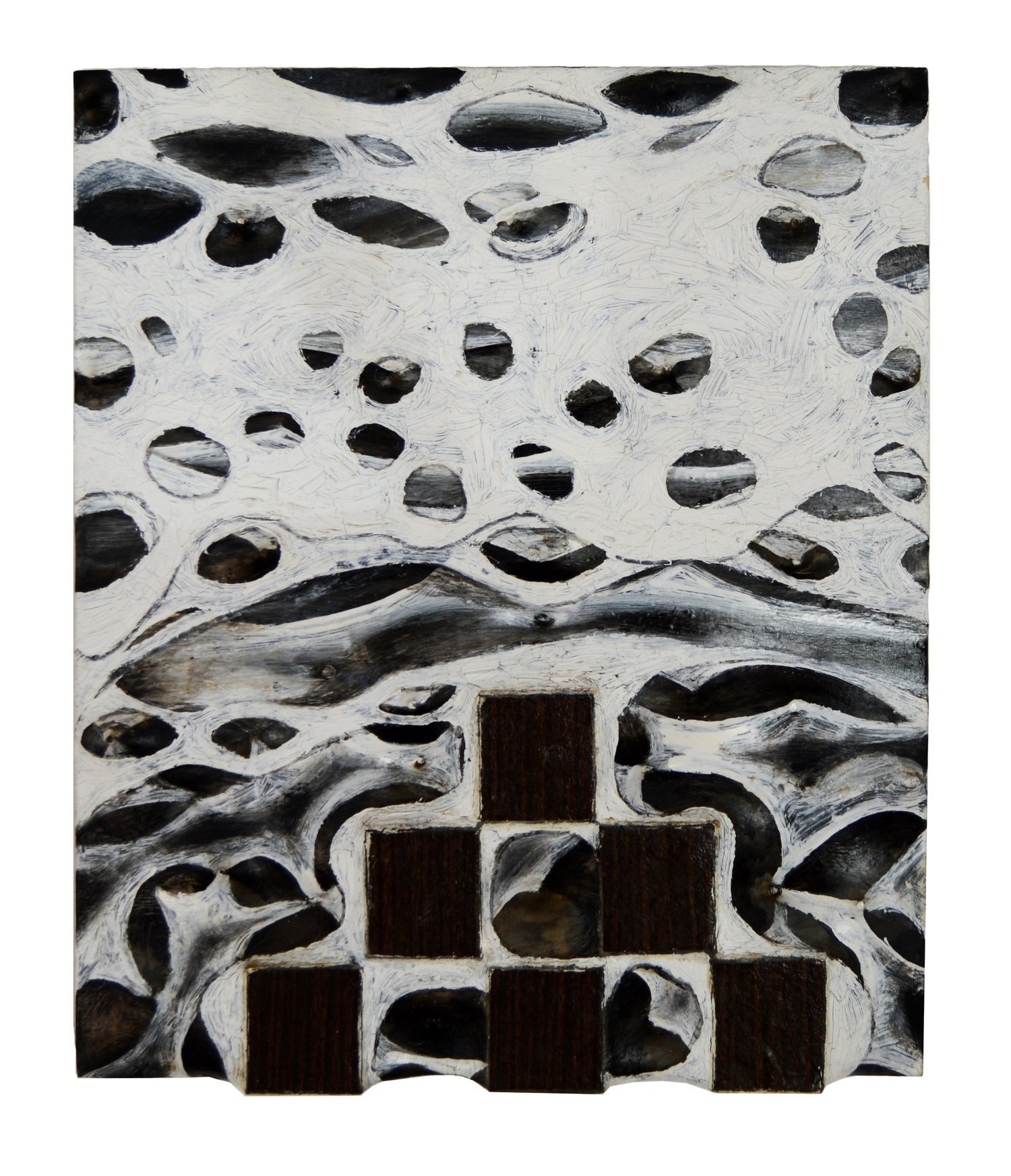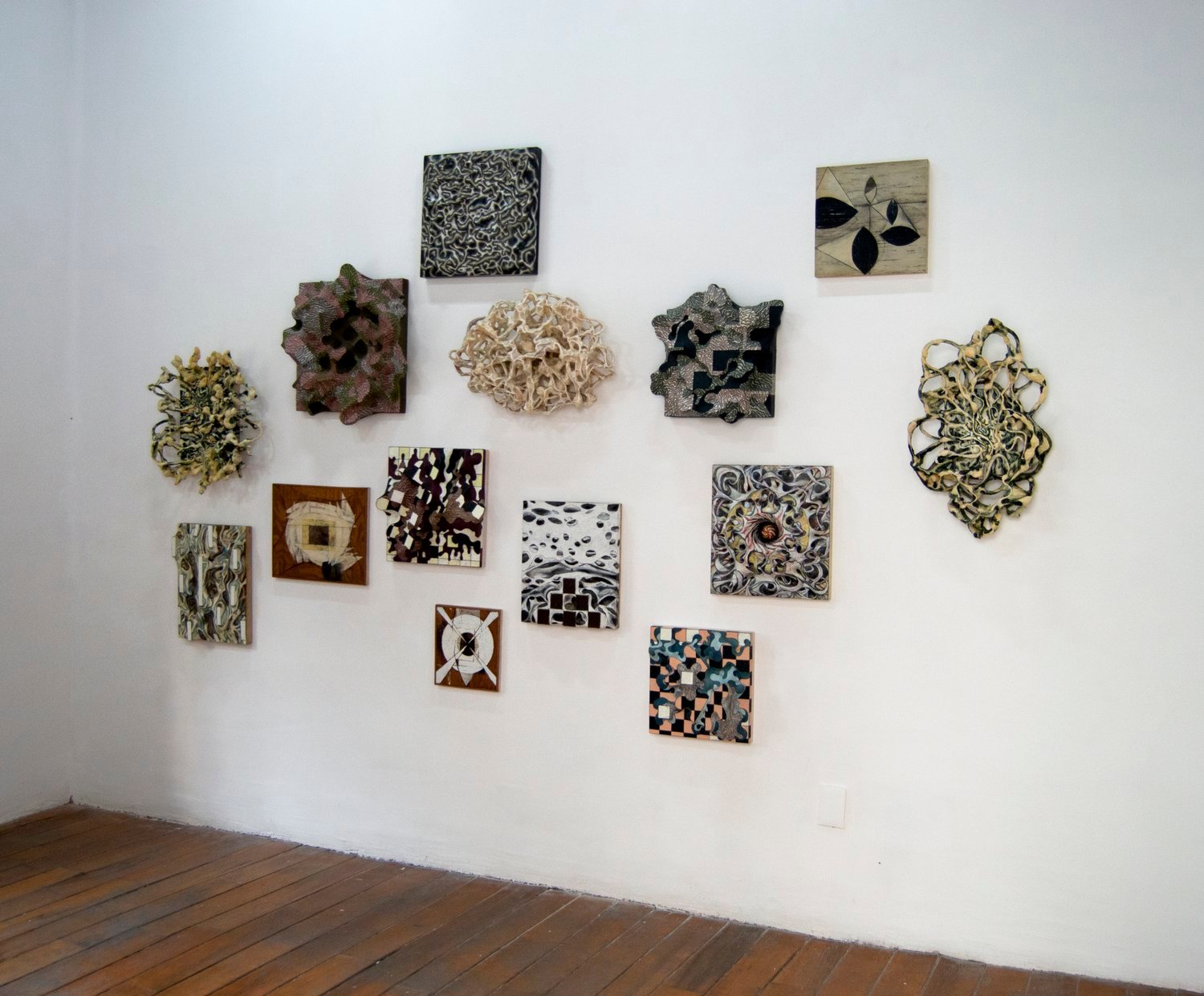 Clearly inspired by orthogonal patterns from which geometric art originates, Thompson transforms the rational rigidity of geometry into organic forms, like protuberances or bulges that undermine, from their bodily and tactile nature, the polished asepsis of the abstract-geometric tradition. The bulbous materiality of his sculptural reliefs and the obsessive, intense pictorial repetitions that cover them bestow upon these works a completely unprecedented place in the tradition of geometric art. In a certain sense, his works embodies – quite literally – a fleshy and corporeal geometry: a truly extravagant –or as mentioned earlier, eccentric–- facet associated with the immaculate language of abstraction.