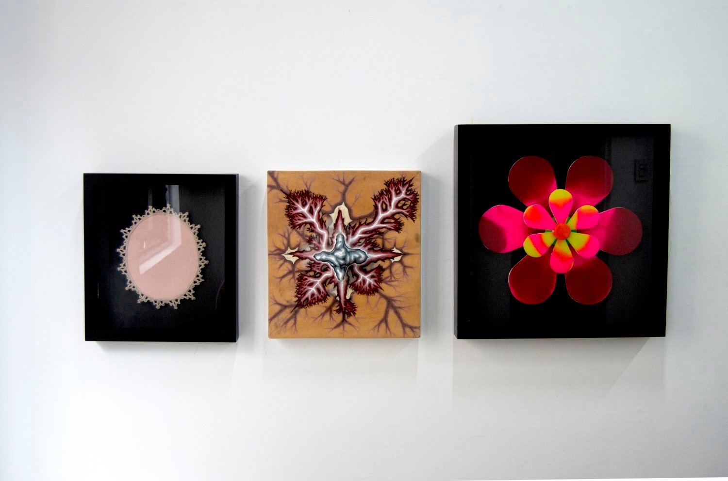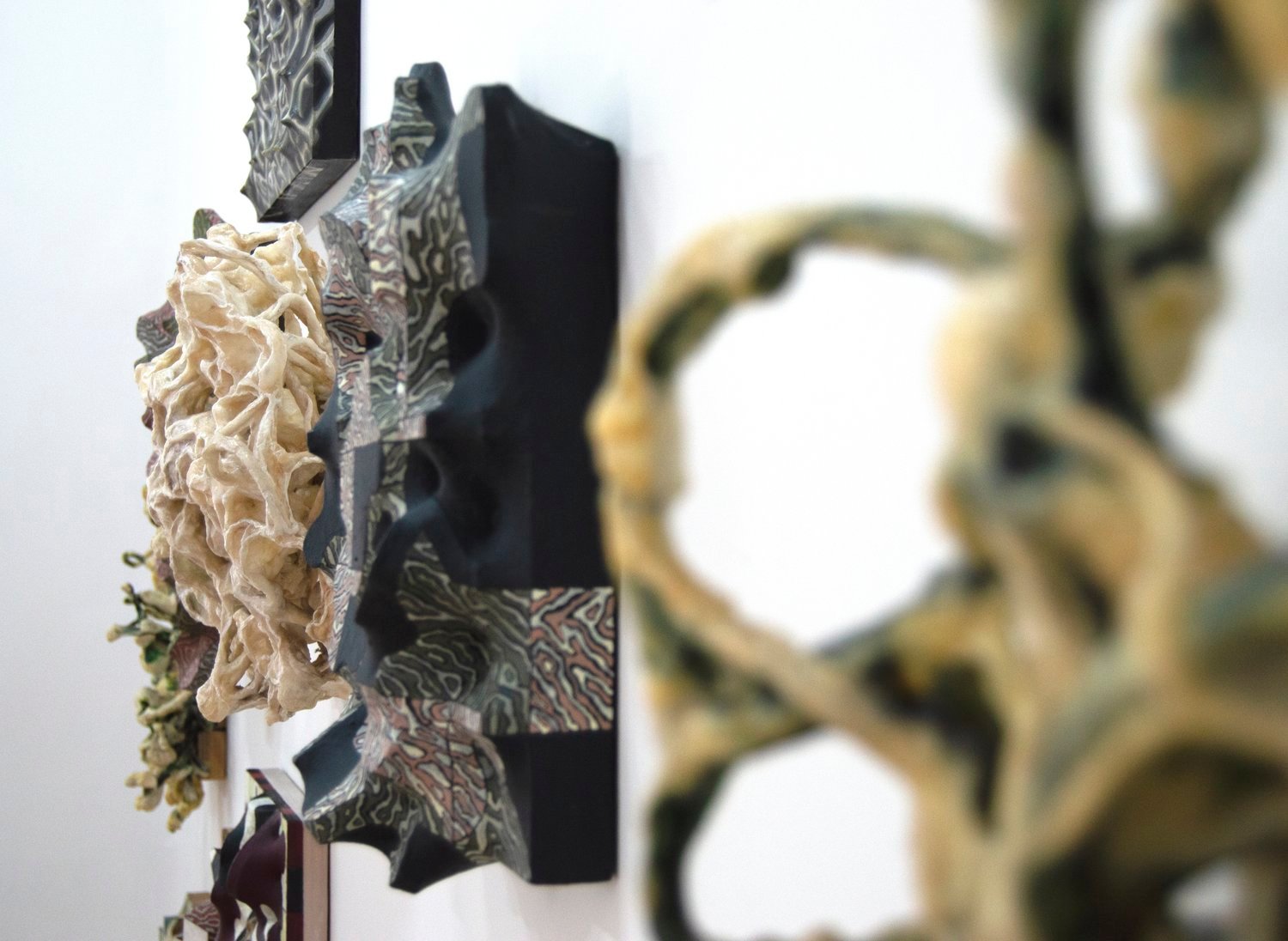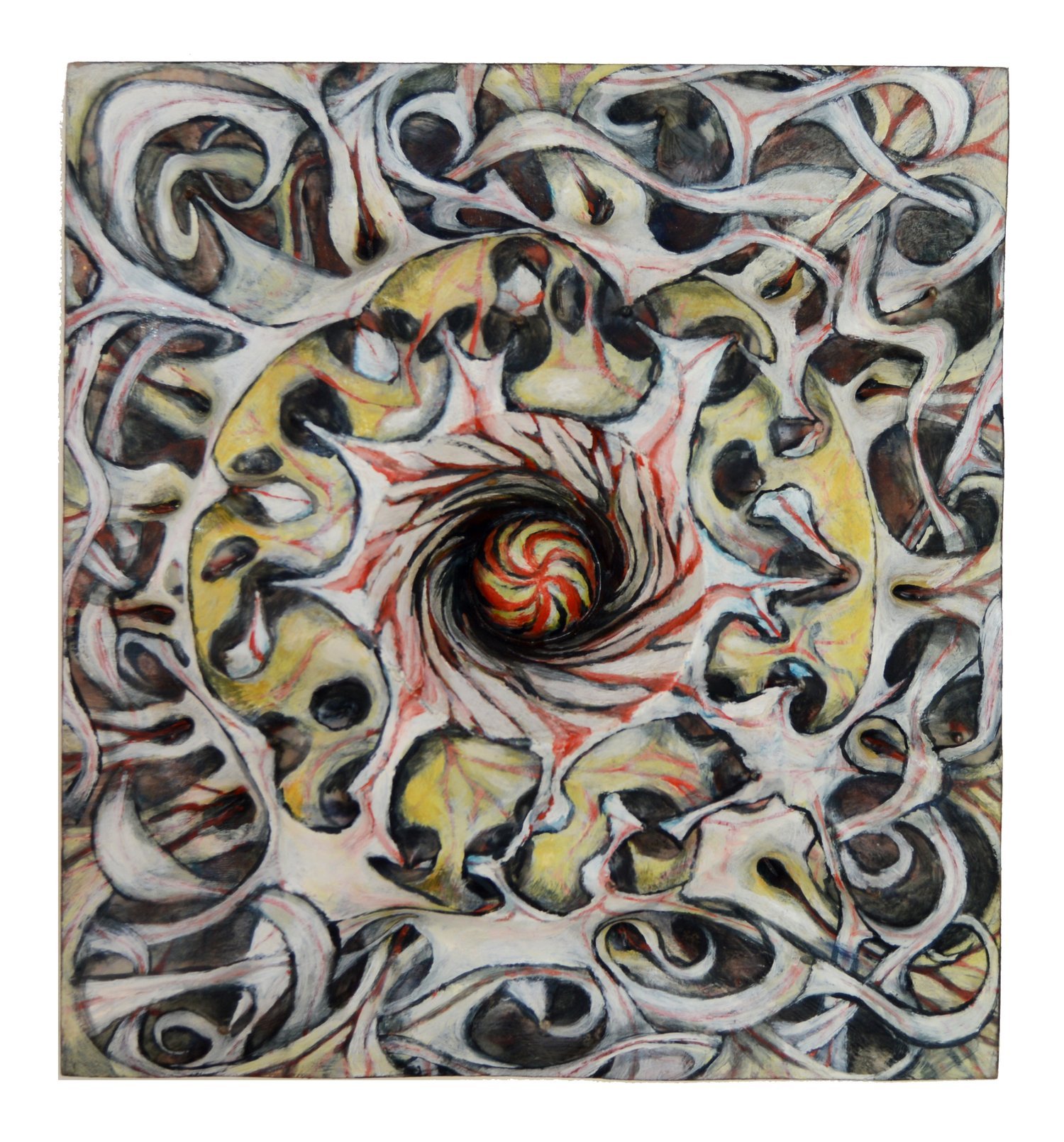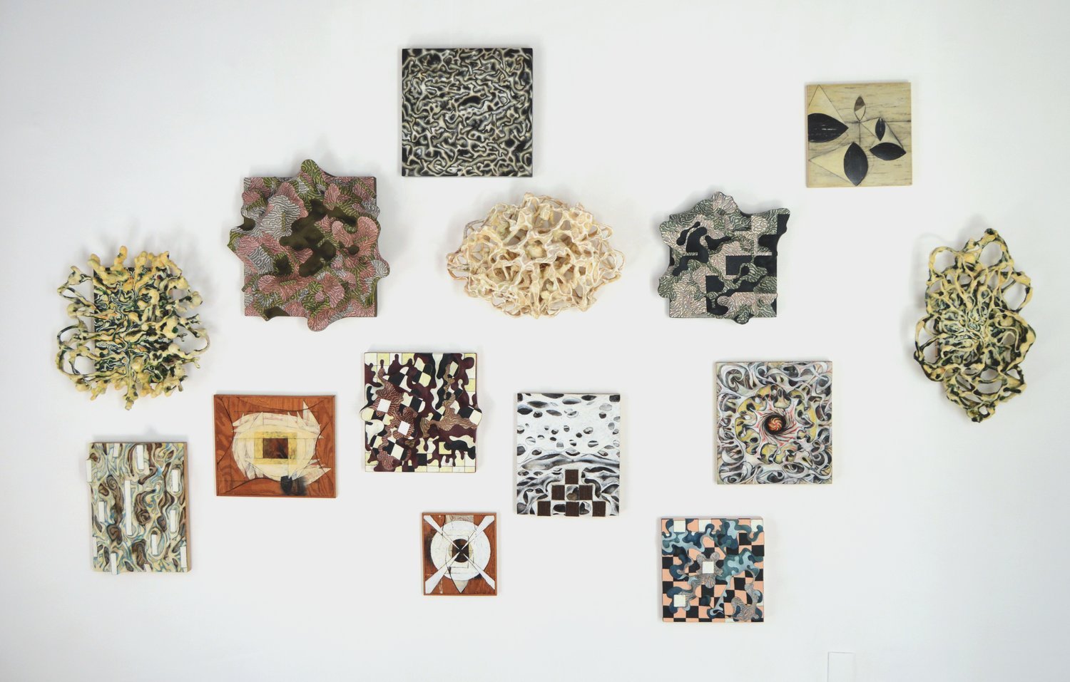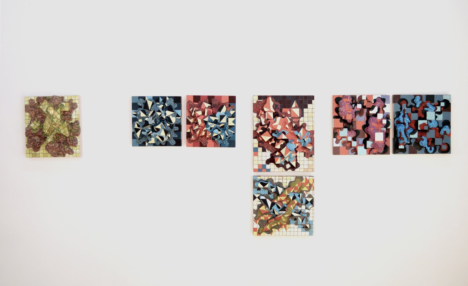 Clearly inspired by orthogonal patterns from which geometric art originates, Thompson transforms the rational rigidity of geometry into organic forms, like protuberances or bulges that undermine, from their bodily and tactile nature, the polished asepsis of the abstract-geometric tradition. The bulbous materiality of his sculptural reliefs and the obsessive, intense pictorial repetitions that cover them bestow upon these works a completely unprecedented place in the tradition of geometric art. In a certain sense, his works embodies – quite literally – a fleshy and corporeal geometry: a truly extravagant –or as mentioned earlier, eccentric–- facet associated with the immaculate language of abstraction.