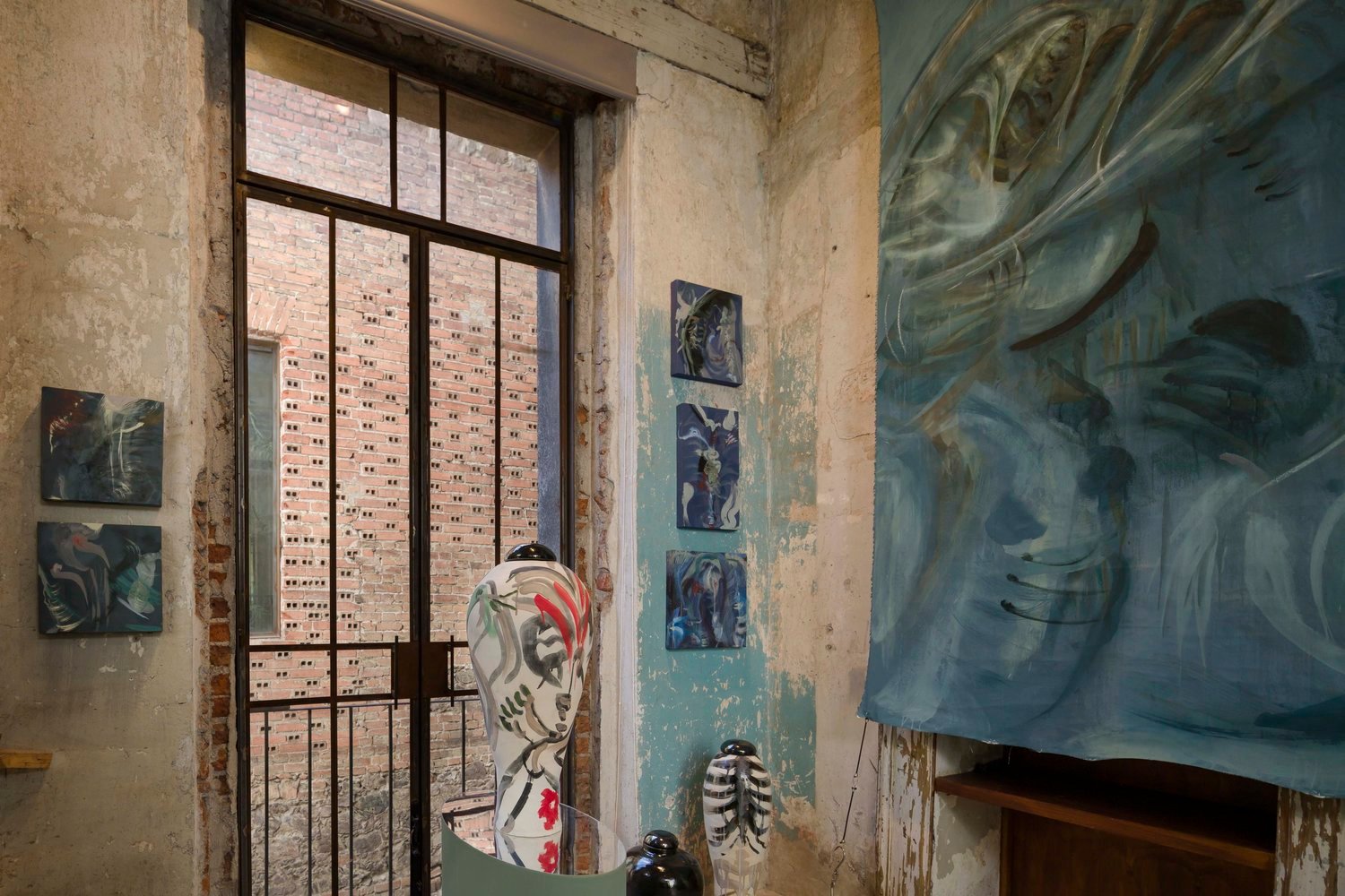 I pull from a cacophony of imagery and let deconstructed figures emerge from decisive, skeletal slashes in psychedelic planes. Marks and movements extrude into a web of primordial signs, influenced by peculiar states of mind, allowing bliss and fury to spill forth in color, texture, and line, eclipsing the cerebral. Only the body, only gesture: a single channel for infinite backstory.