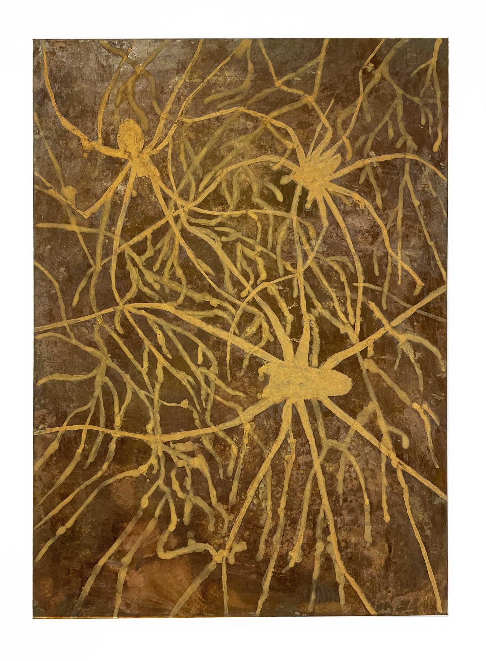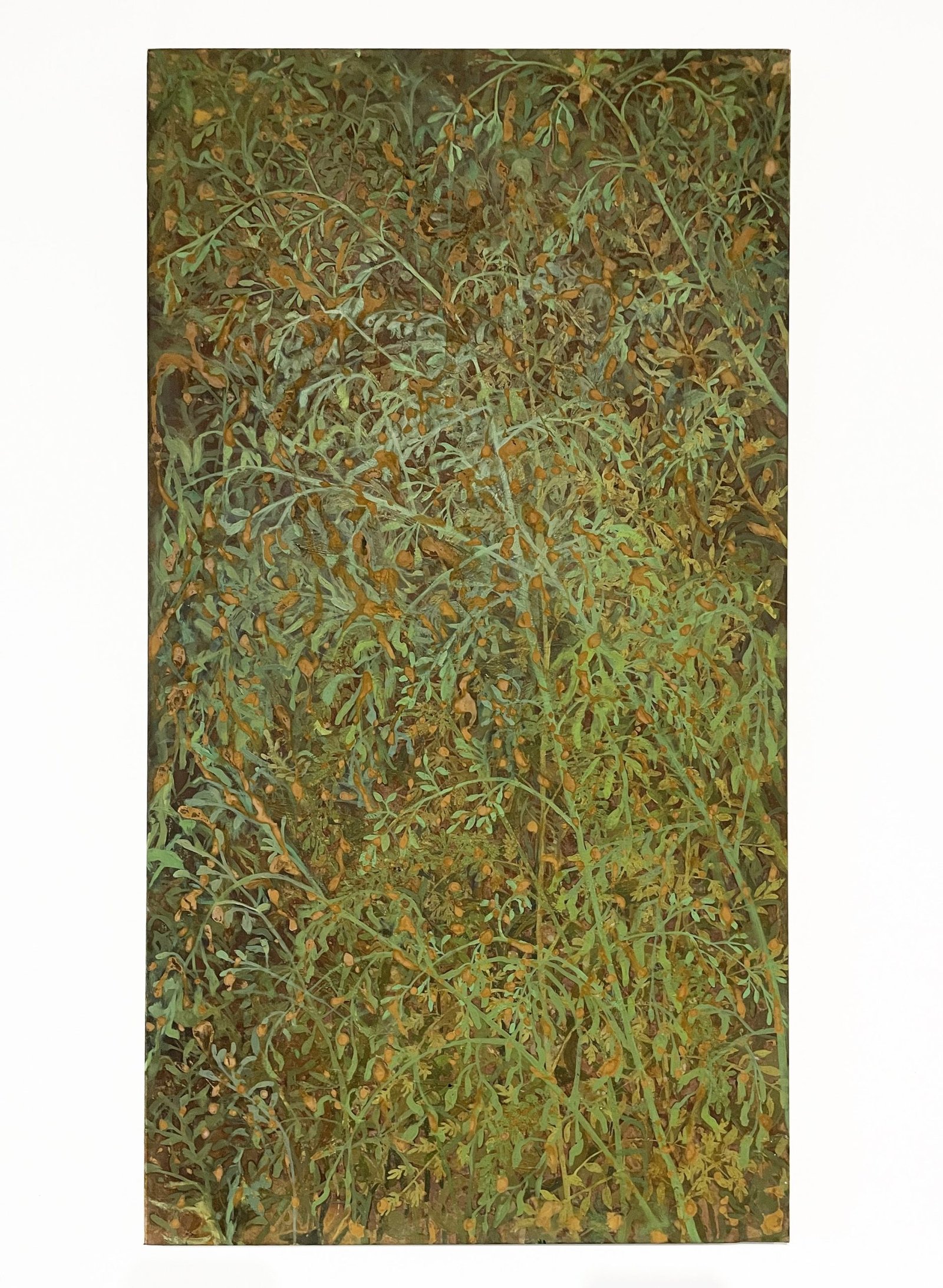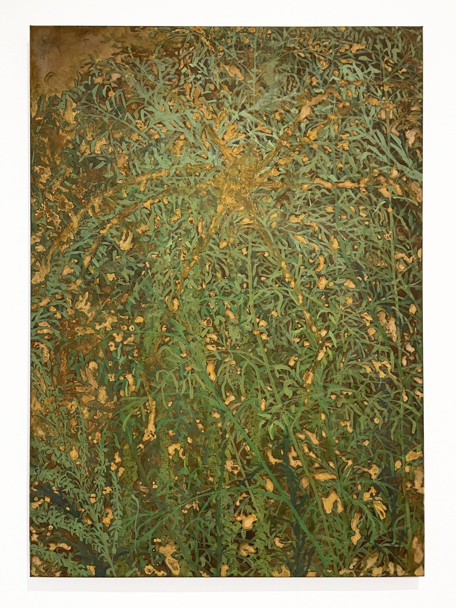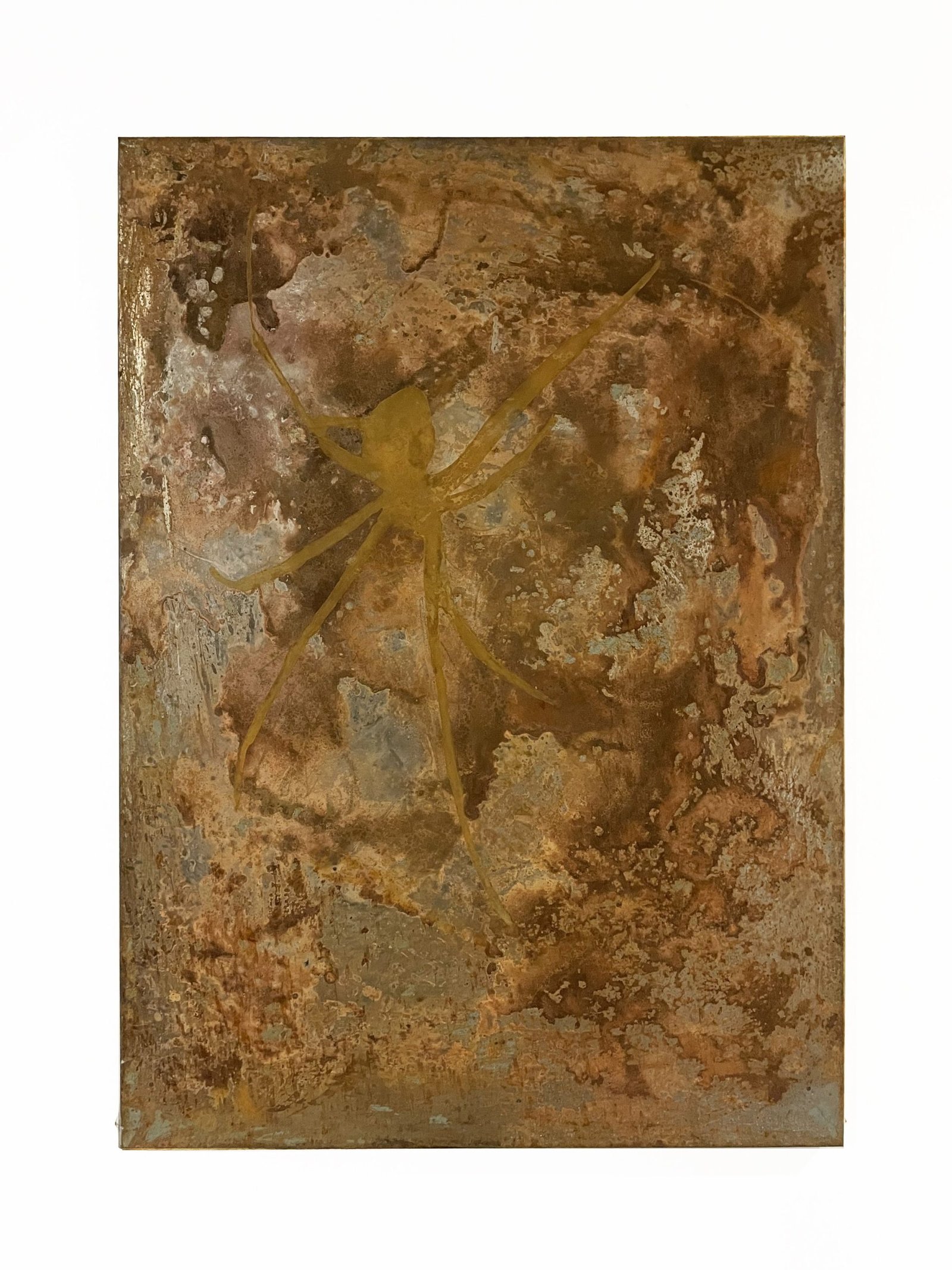 Experimento mediante el uso de óleo y pátinas sobre metal, considerando el paso del tiempo sobre un material que tiende a oxidarse, verticalidad en la composición para plasmar visualmente fuerzas naturales como la gravedad, el peso, el crecimiento y el movimiento, la depuración de las formas insiste en la contemplación de lo abstracto hacia lo figurativo y viceversa.